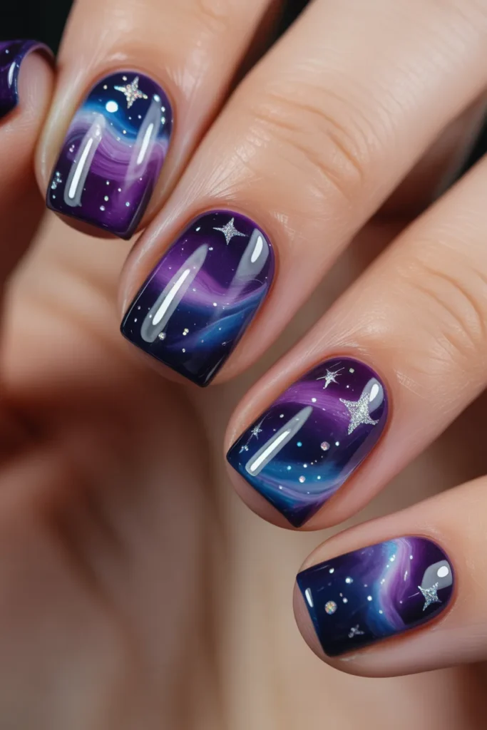 Blend deep purples, blues, and glitter for a cosmic, dreamy effect.