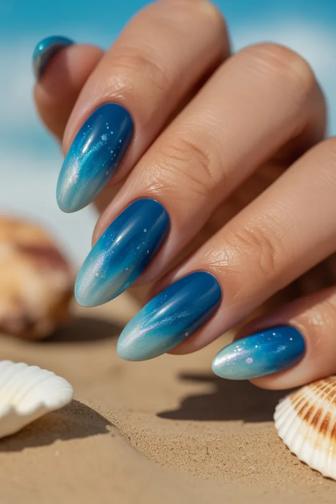 Shades of blue with subtle shimmer evoke a calming sea-inspired look.