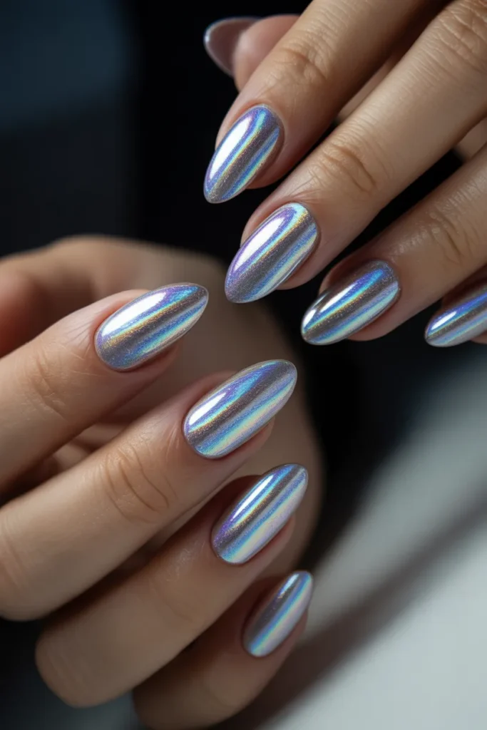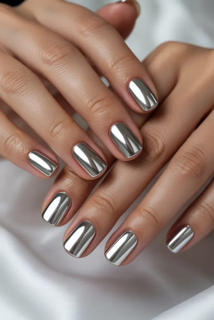 Mirror-like chrome nails in silver, gold, or rose gold for ultimate glam.