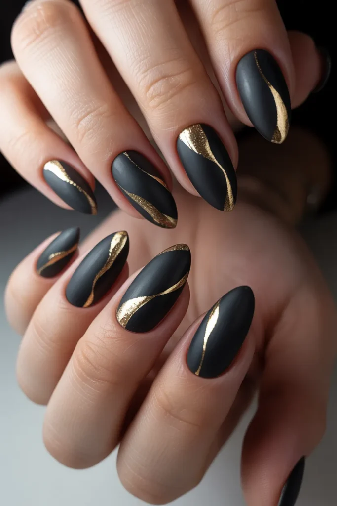 Black matte gel nails paired with delicate gold lines for an edgy, sophisticated look.