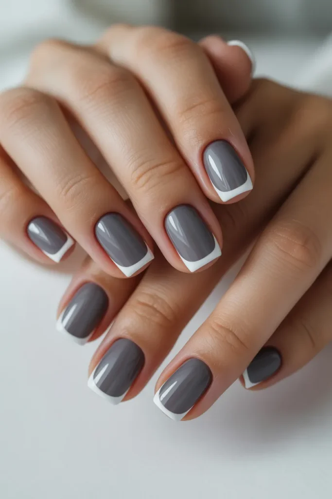 Soft grey matte nails with clean white tips for a modern twist on French nails.