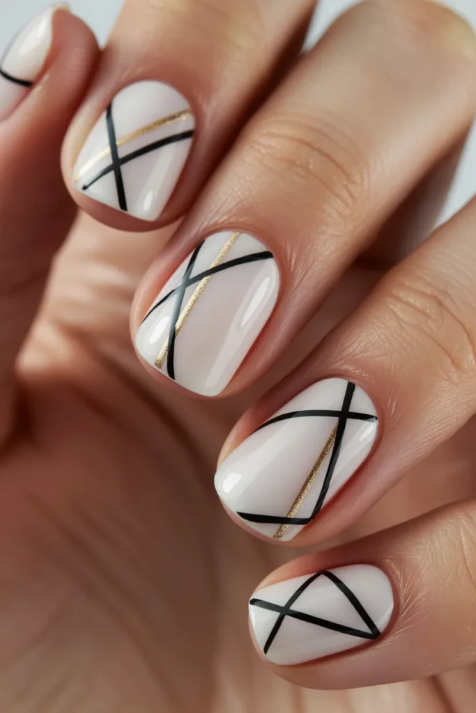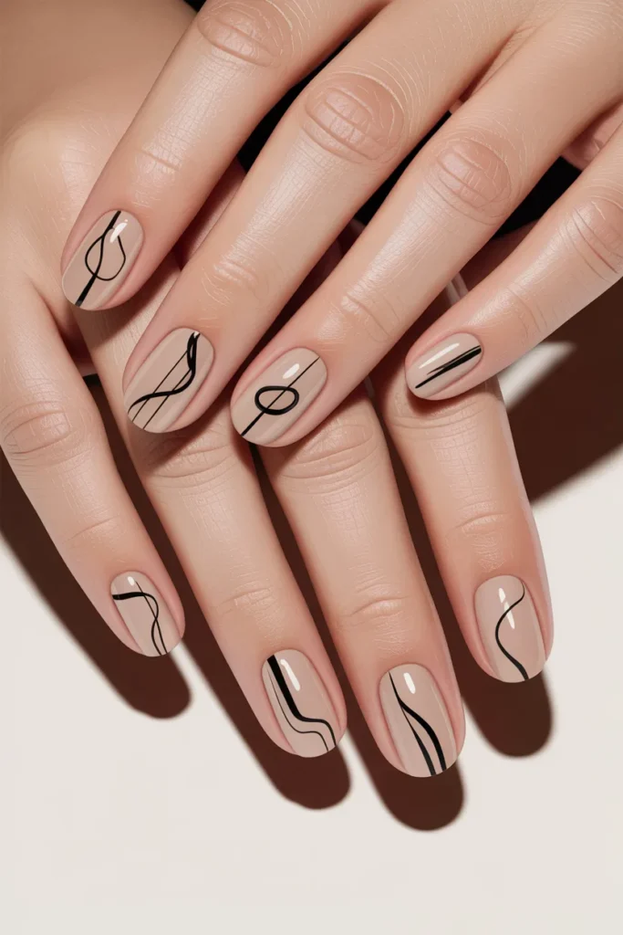 Delicate black lines or abstract shapes on nude nails for a sophisticated minimalist style.