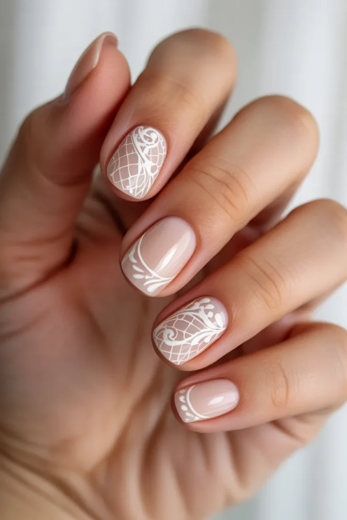 Delicate lace patterns on nude or light pink gel for ultra-feminine vibes.
