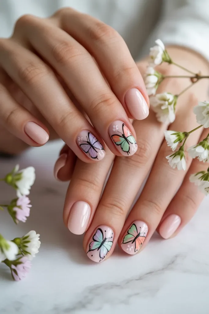 Cute butterfly stickers or hand-painted designs for playful, trendy nails.