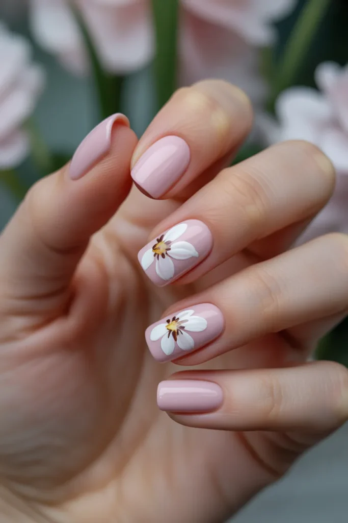 Hand-painted tiny flowers on soft pink or nude base for feminine elegance.