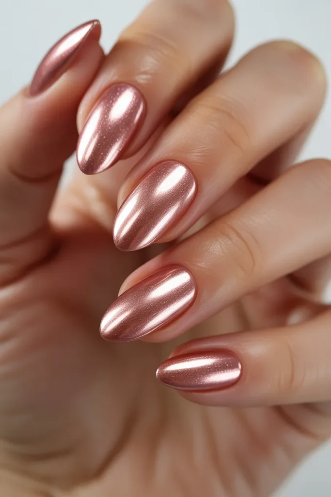 Rose gold nails bring a soft metallic glow that feels both elegant and modern.