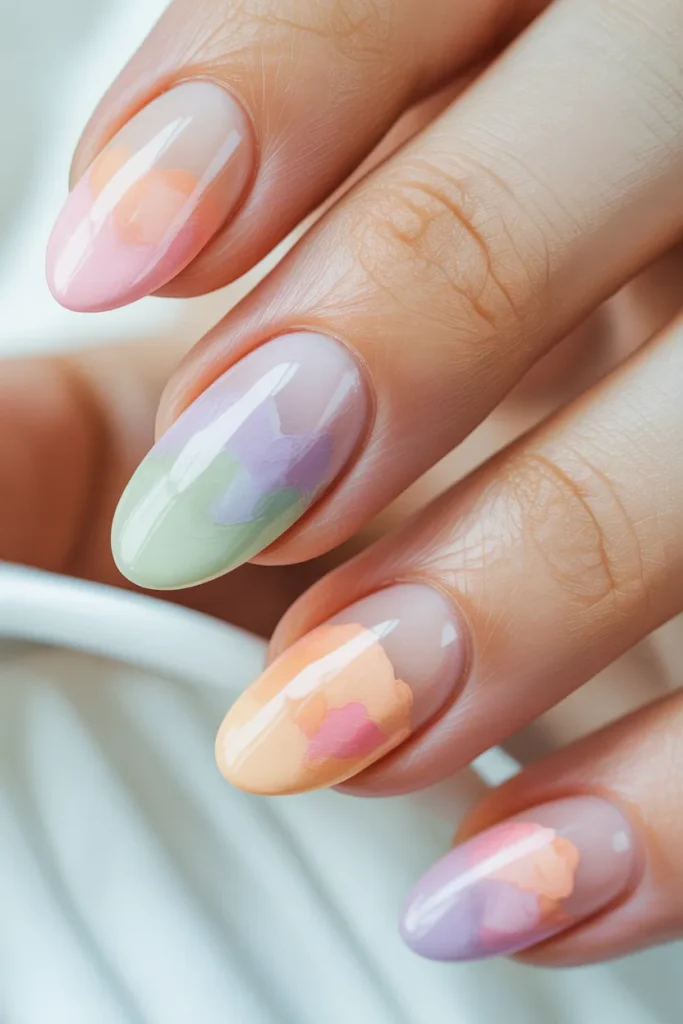 Watercolor nails blend soft hues together for a dreamy, artistic effect.