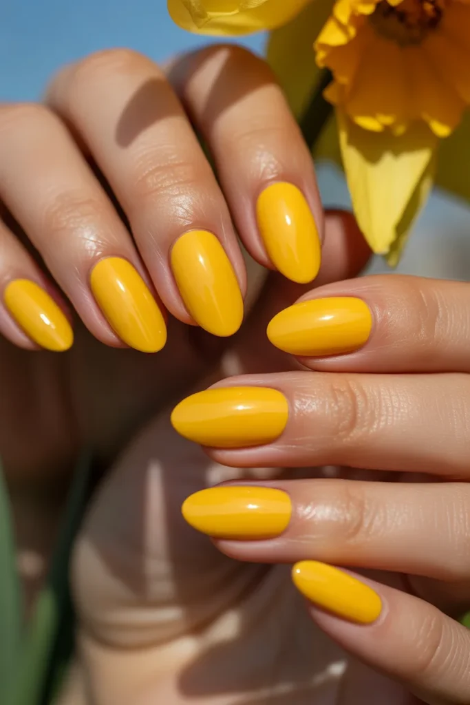 Lemon yellow nails instantly brighten your look with a cheerful and sunny vibe. This bold spring shade adds energy without being too overwhelming.