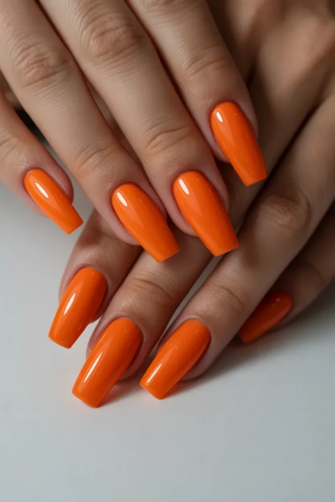 Soft coral orange nails offer a subtle and elegant take on the orange trend. The muted tone makes them perfect for everyday wear or professional settings. They look classy, clean, and effortlessly chic. A glossy or satin finish enhances their natural beauty.