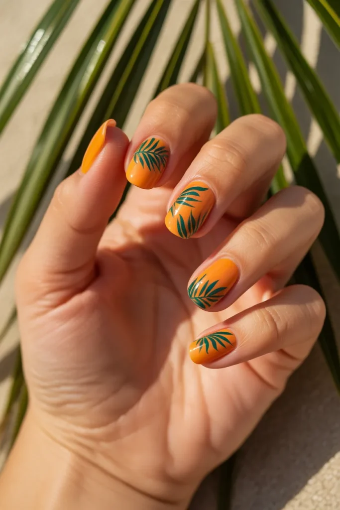 These nails feature orange tones combined with tropical elements like palm leaves or sunsets. The design instantly gives vacation vibes and feels lively and refreshing. Perfect for summer outings, beach trips, or holidays. Adding a glossy finish enhances the vibrant tropical feel.