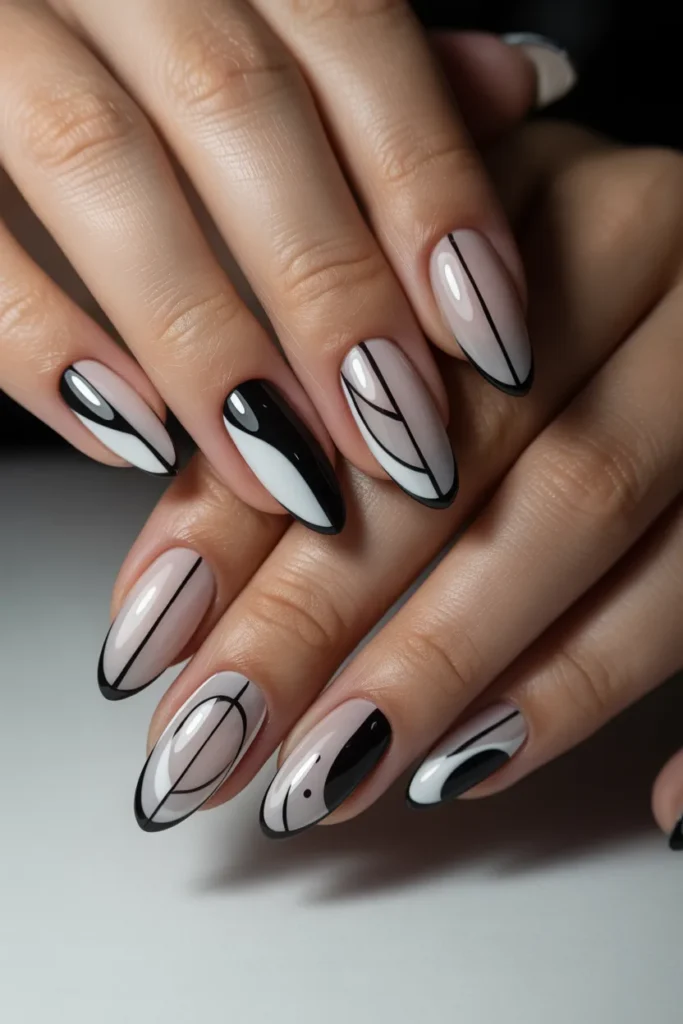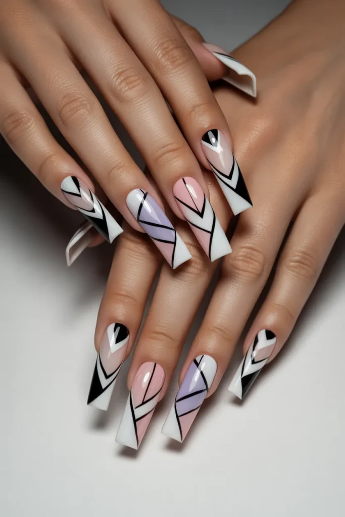Sharp geometric patterns in contrasting colors are perfect for a modern, edgy manicure.