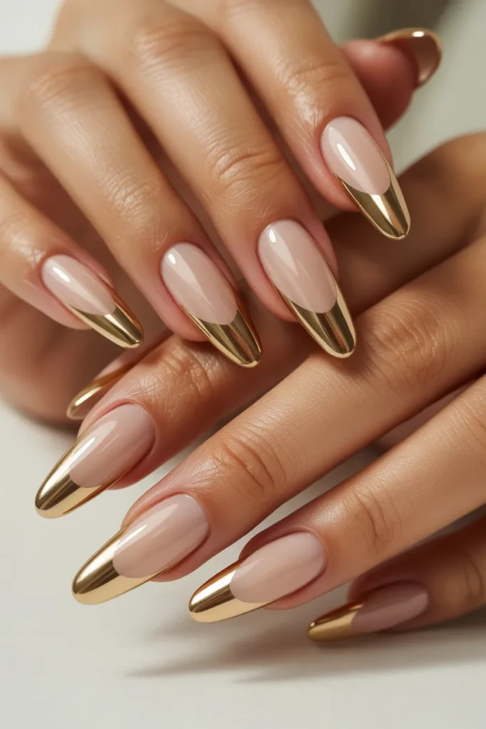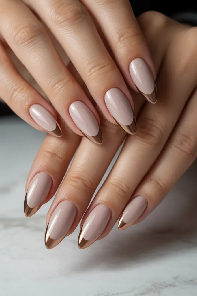 Tips coated in metallic shades add subtle glamour to neutral bases.