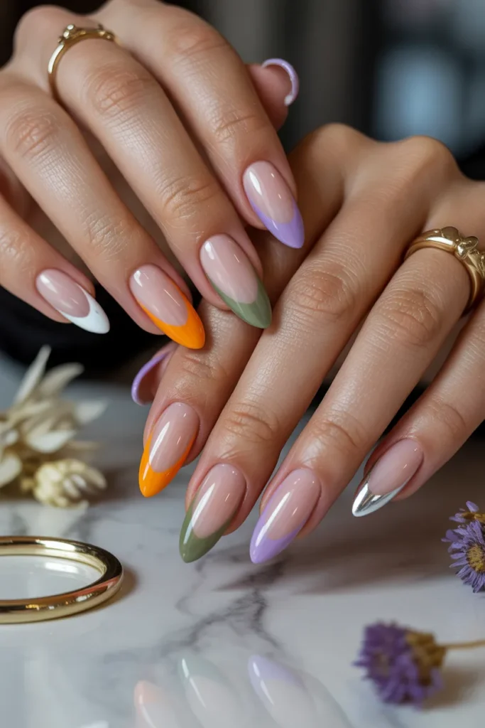 Modernized French tips with colored edges, glitter, or ombre instead of classic white.