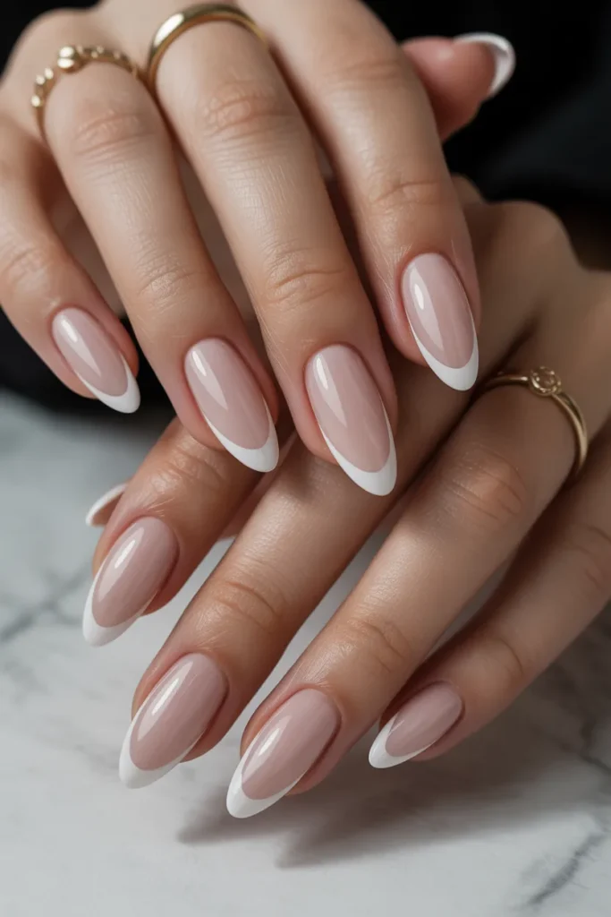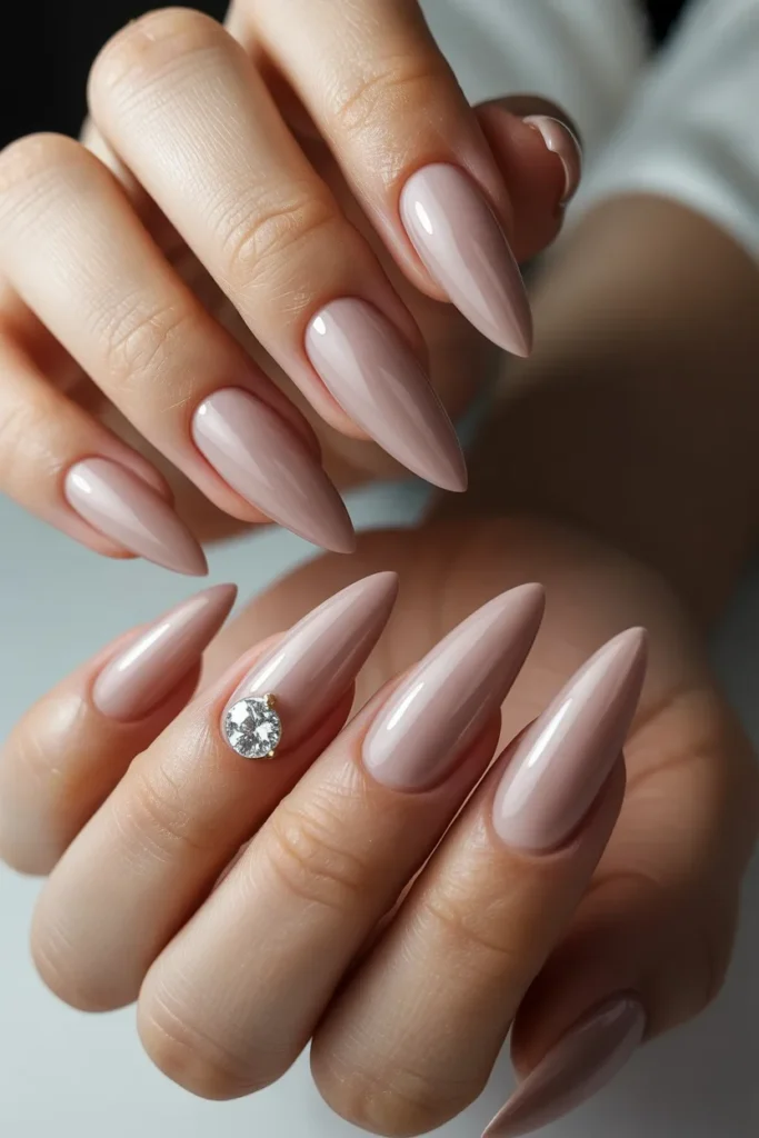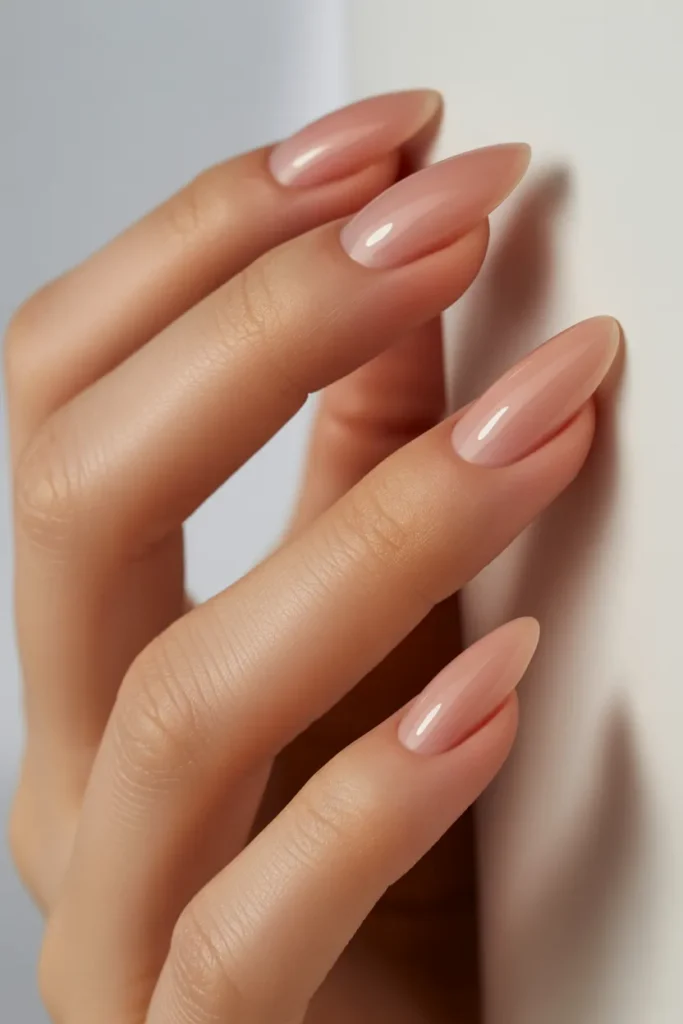 Clean nude nails with a glossy finish are perfect for a polished, understated look that never goes out of style.