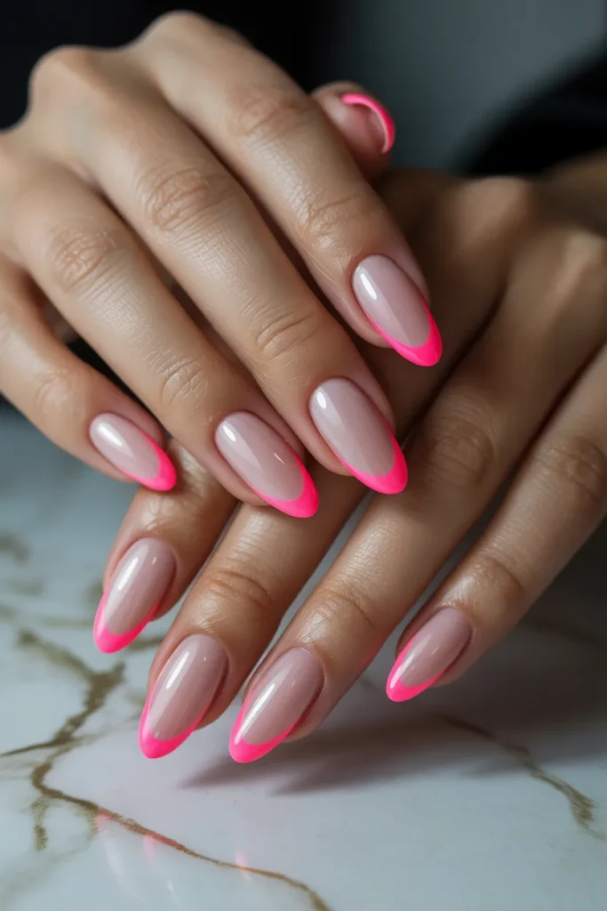 Neutral nails with neon-colored tips combine subtlety and boldness.