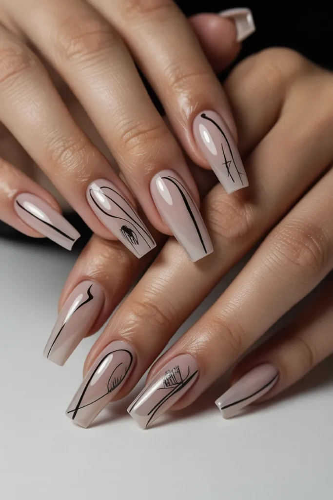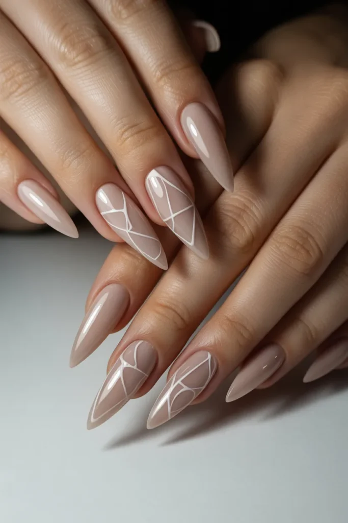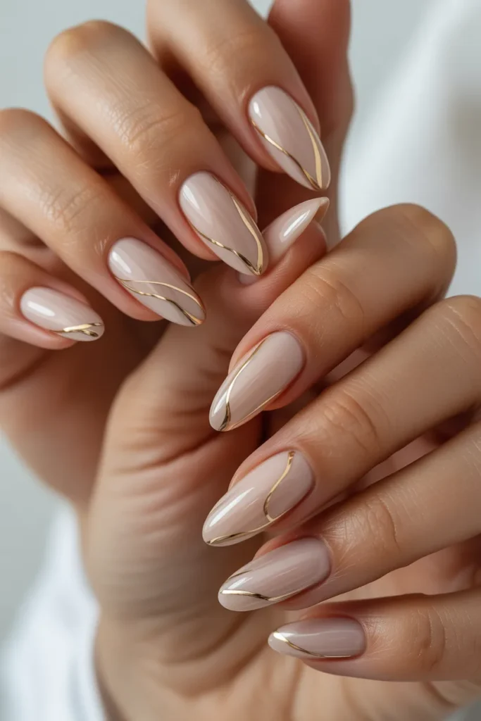 Thin gold lines over nude or pastel nails create chic, elegant designs.