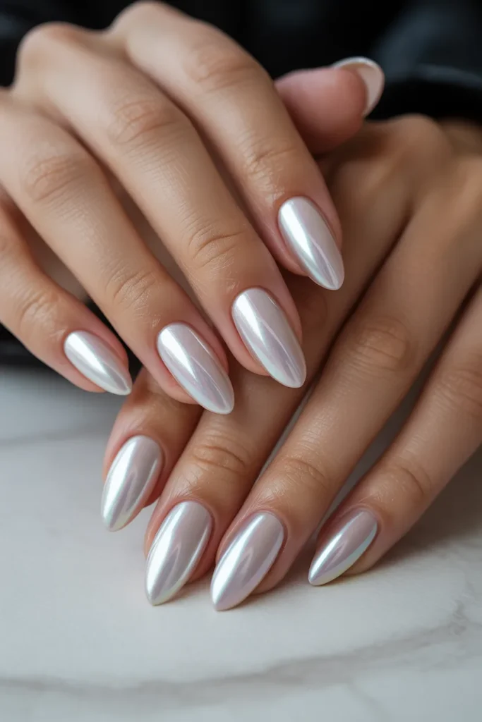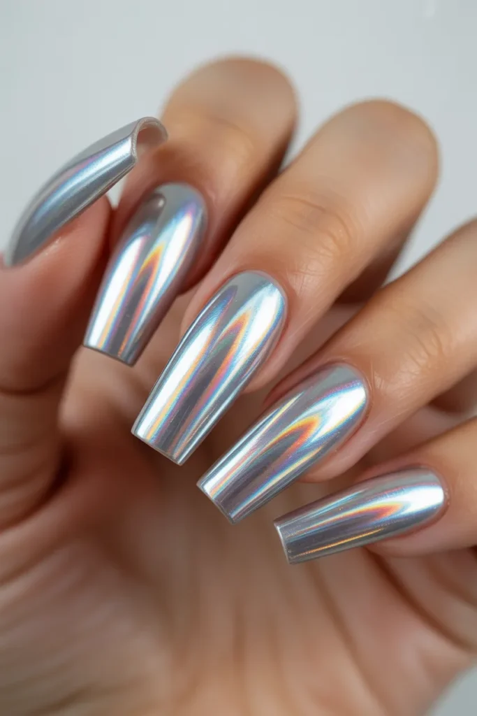 Metallic, mirror-like nails with holographic effects are perfect for futuristic 2026 vibes.