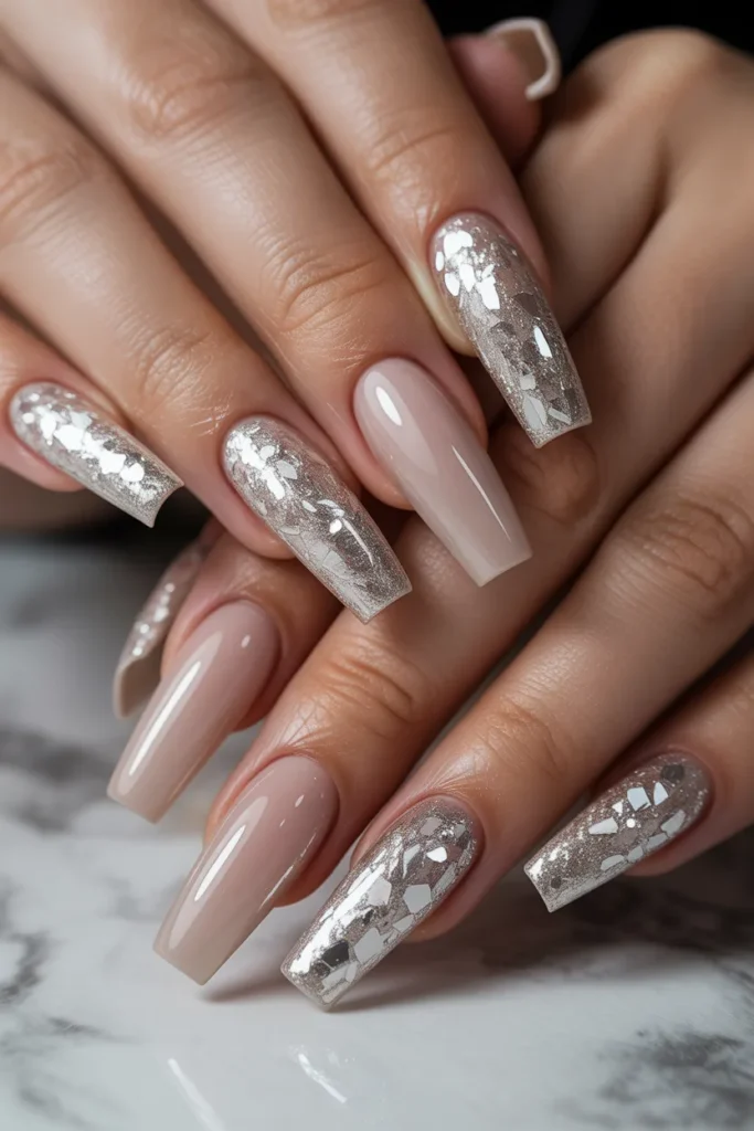 Gold or silver foils on one or two nails create a striking, metallic effect.