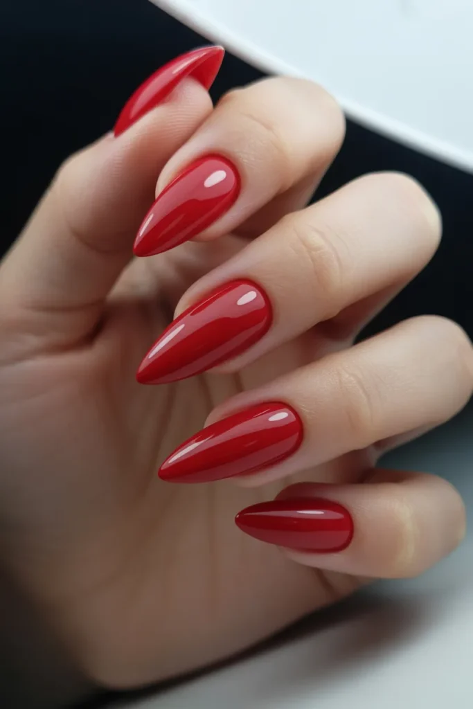 Vibrant red nails in stiletto shape make a dramatic statement, perfect for nights out or glamorous events.