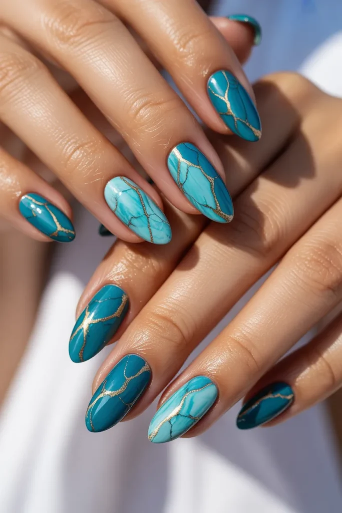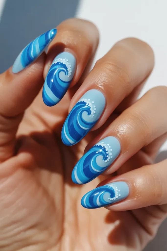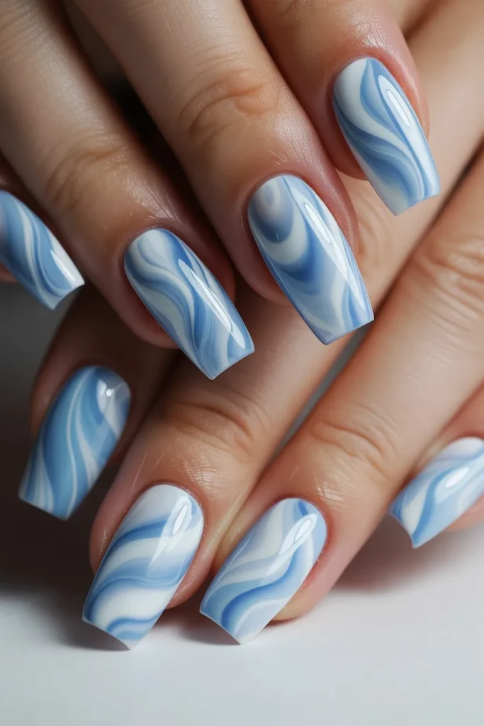 Swirl designs are trending and perfect for summer. The sky-blue shade feels fresh and calming, like a beach day breeze.