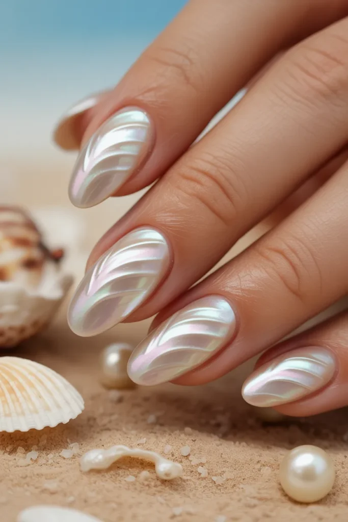 Pearl nails shimmer beautifully in sunlight. They’re elegant yet beach-inspired.