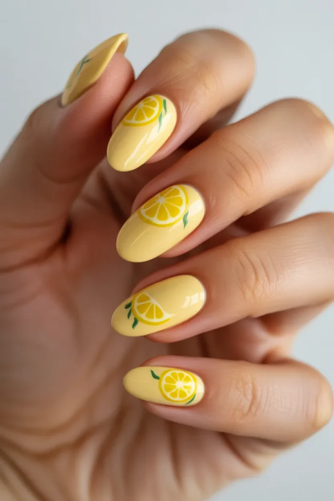 Lemon nail art looks crisp and refreshing. The bright yellow pops beautifully in sunlight and complements summer outfits effortlessly.