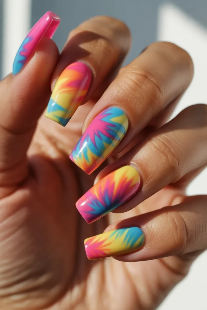 Tie-dye nails bring retro summer festival vibes. Each nail looks slightly different, making the set unique and fun.