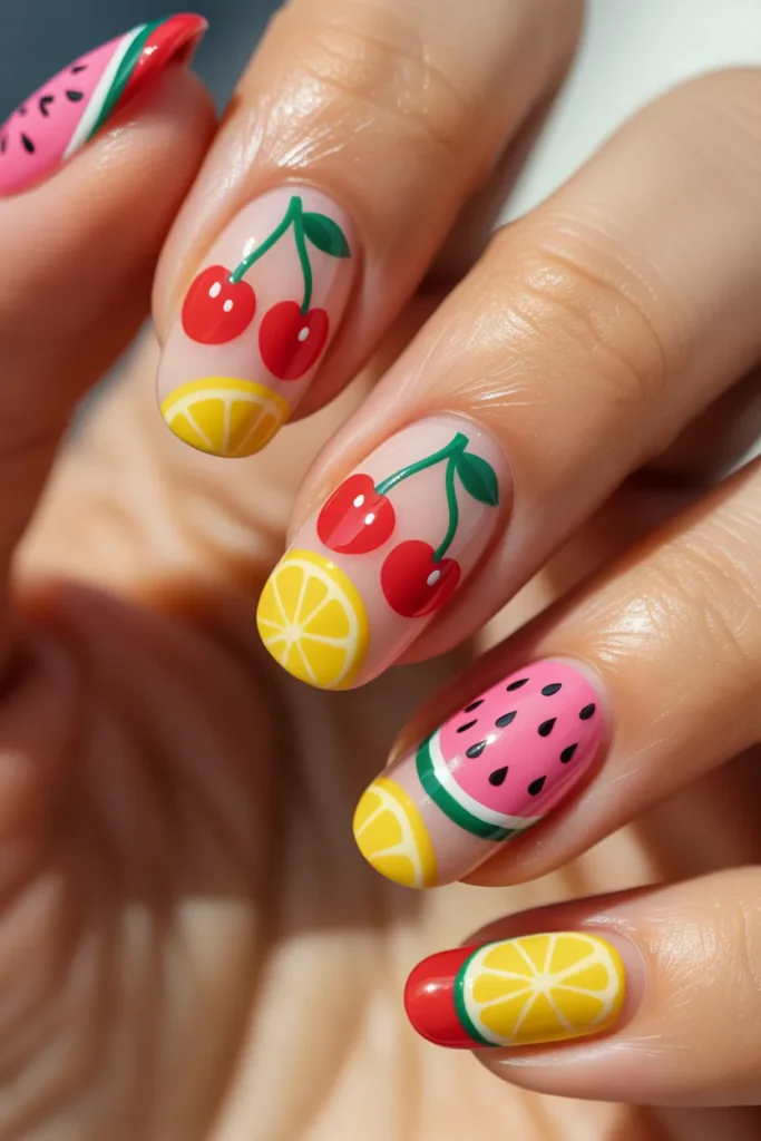 Why choose one fruit when you can have them all? Mixed fruit nails are cheerful, bright, and totally summer-approved.