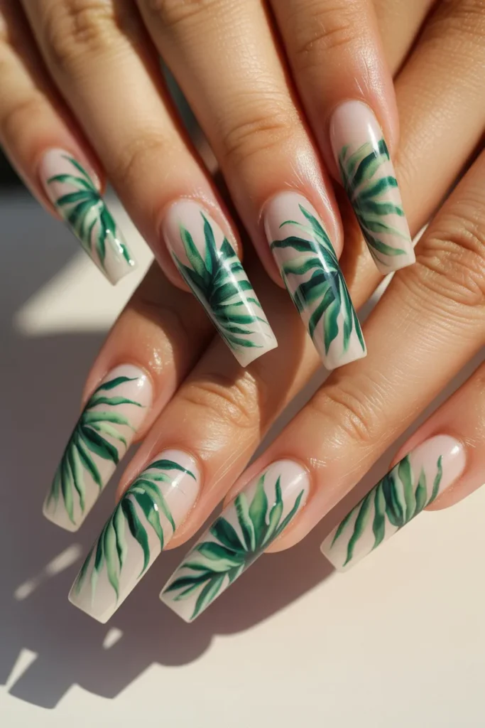 Palm leaf nail art gives instant vacation vibes. The leafy details pop beautifully against soft base colors. Perfect for beach trips and poolside selfies.