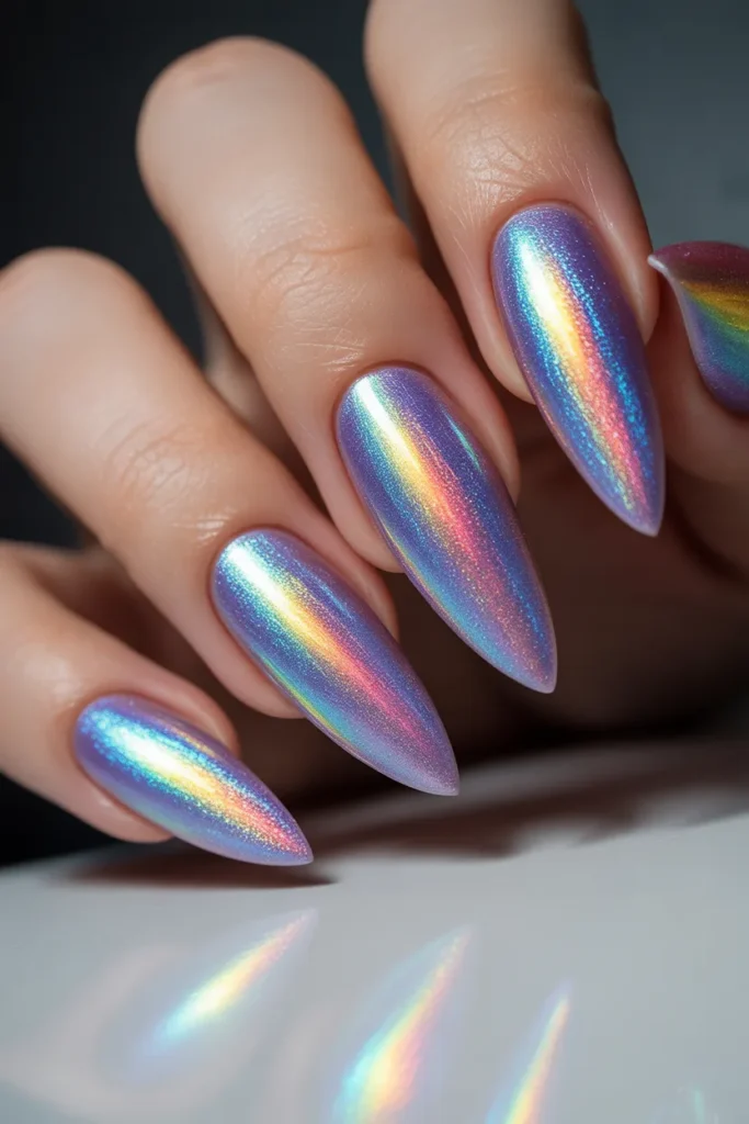 Holographic nails sparkle in every angle of sunlight. They’re dramatic and glam.