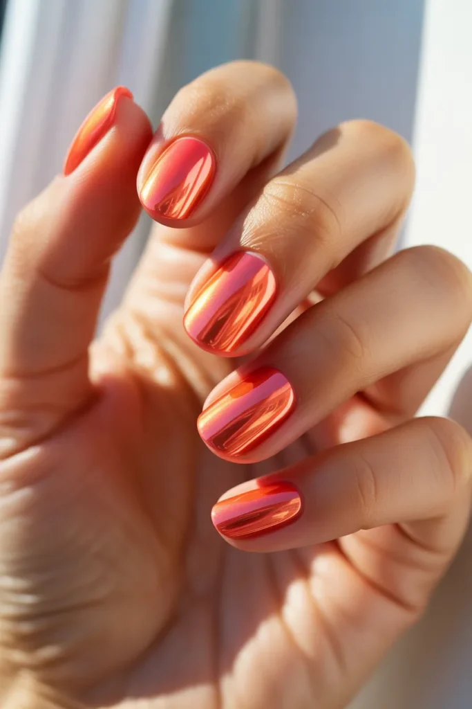 Chrome nails bring serious glow-up energy. Coral adds warmth and looks stunning against sun-kissed skin.
