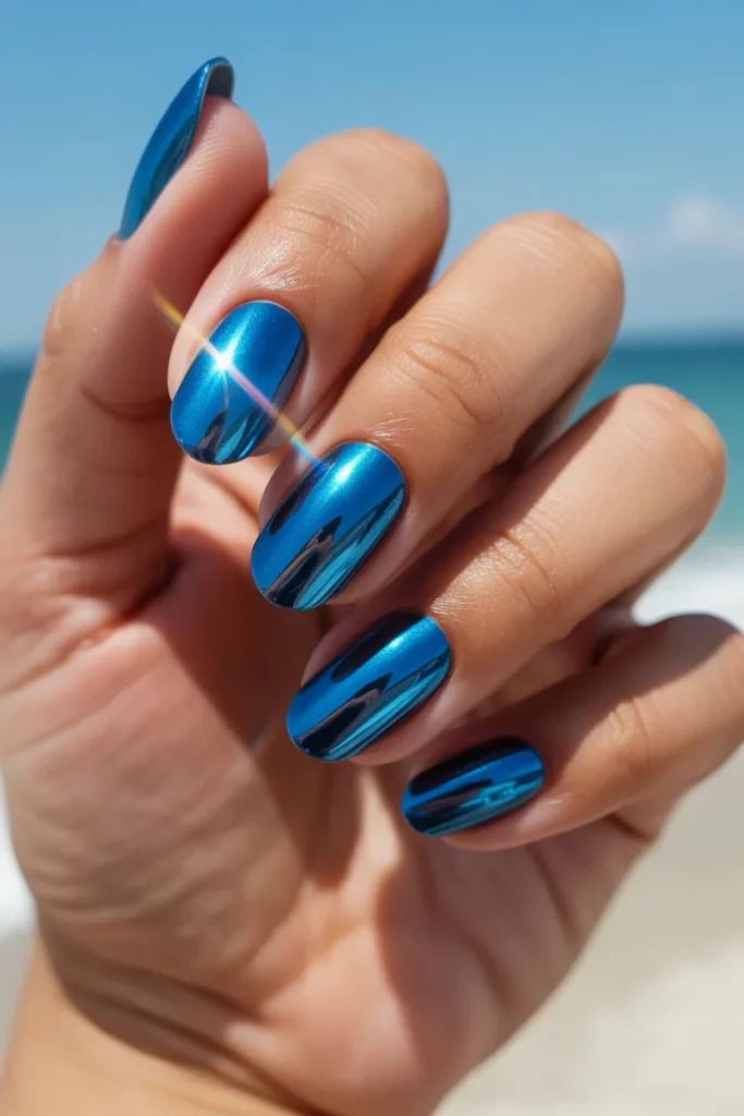 Blue chrome feels futuristic and bold. It’s perfect for summer nights out.