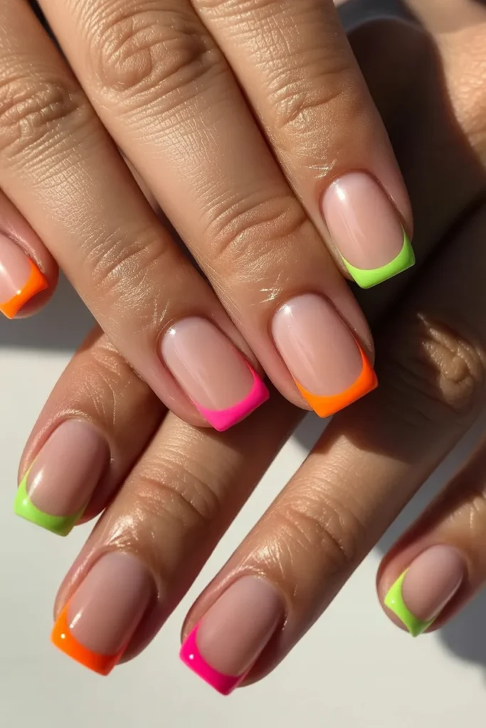 Turn up the heat with electric neon tips. This bold twist on the classic French manicure screams summer energy. Pair it with gold rings for a full glow-up moment.