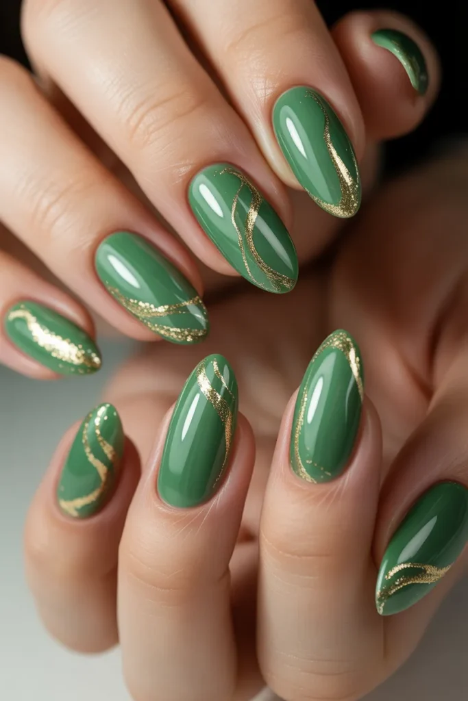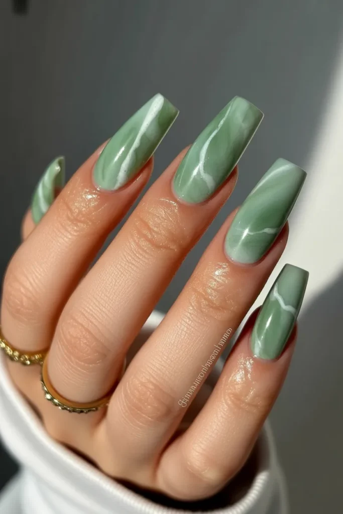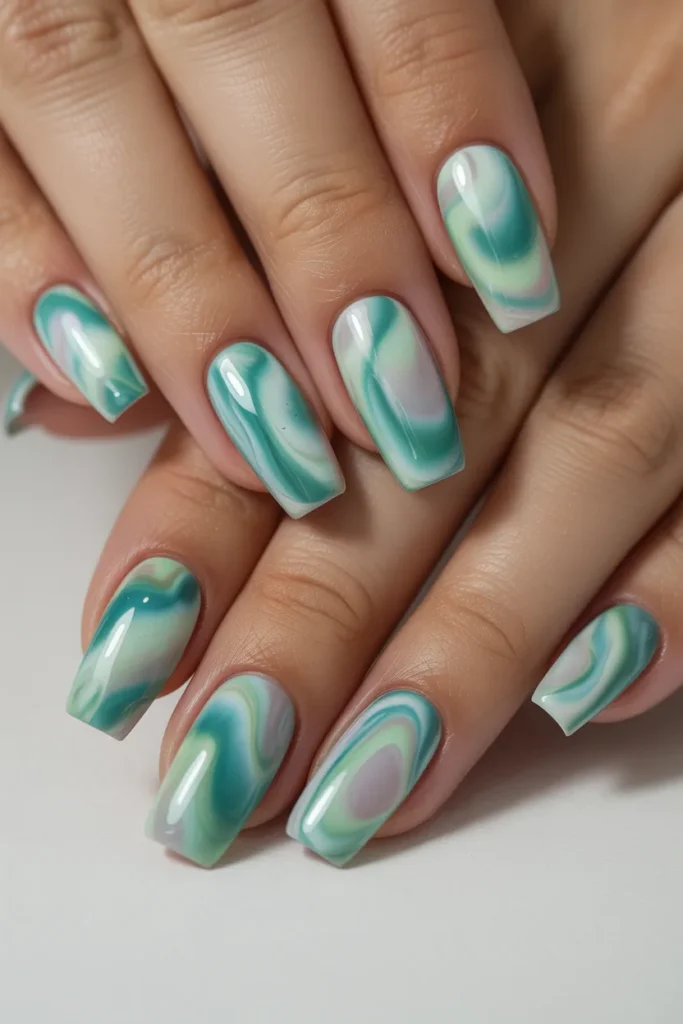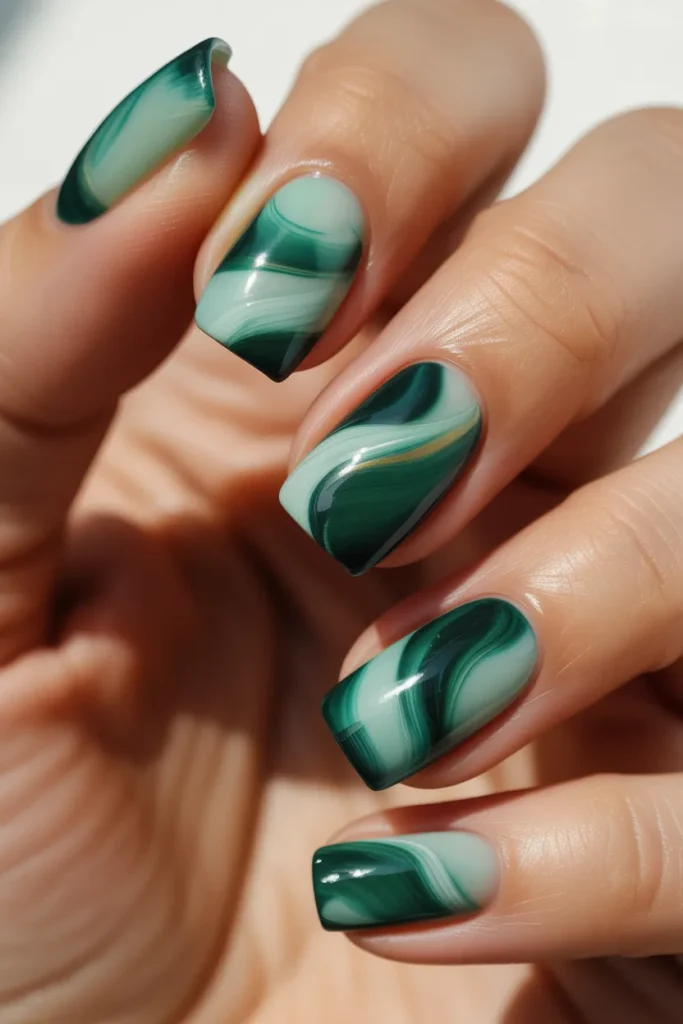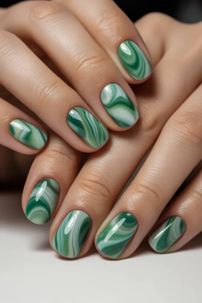 Swirled patterns in different shades of jade add a dreamy, artistic effect. Each nail becomes unique with flowing lines and blended greens. This design is perfect for those who love creative, statement-making nails.