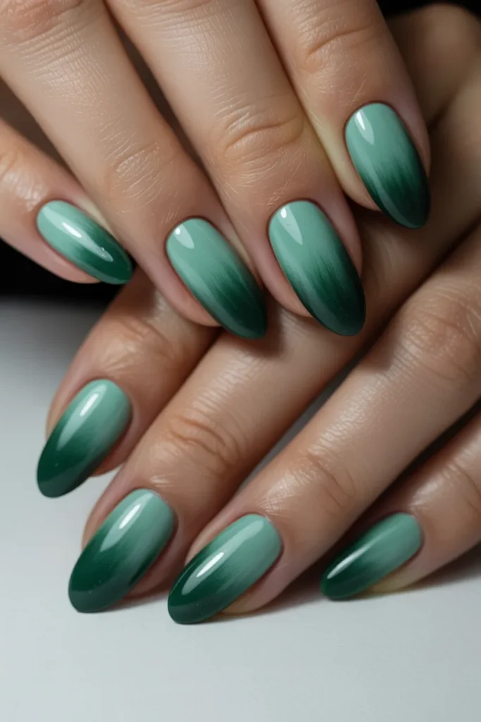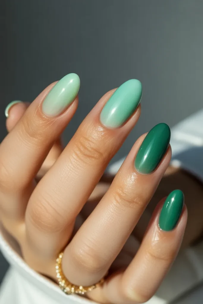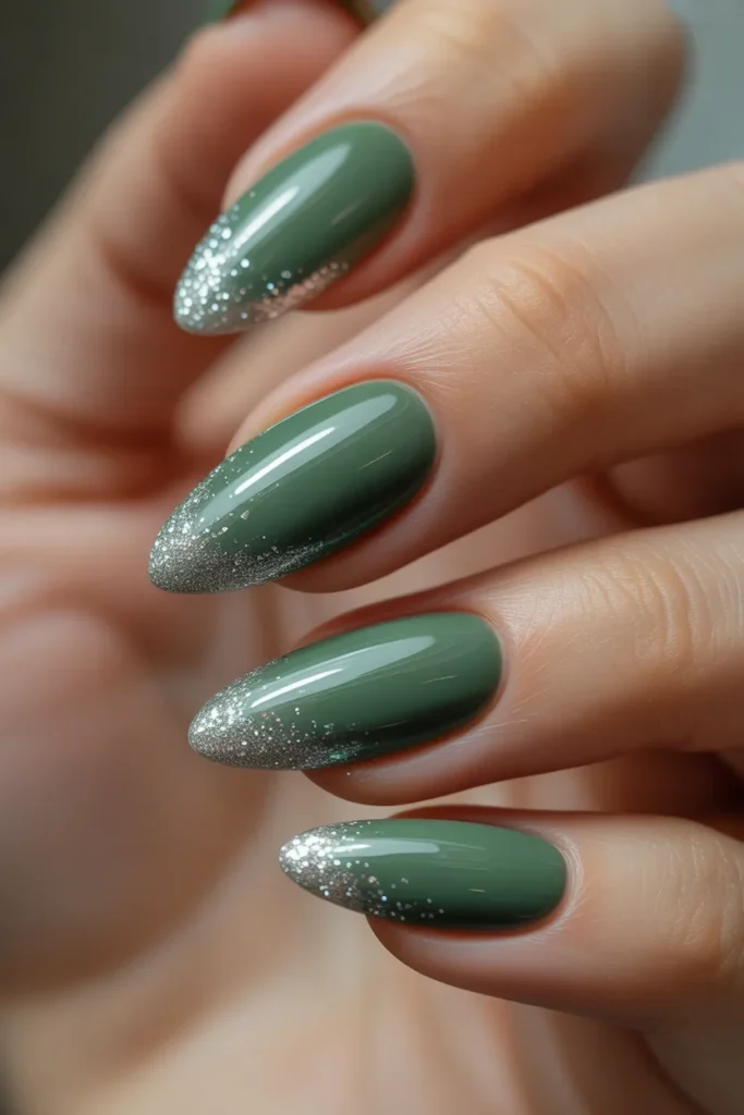A gradient of glitter over jade nails adds a dreamy, sparkling effect. The shimmer softly fades from the cuticle or tip, creating a delicate and feminine look. This versatile design works for both casual days and glamorous nights.
