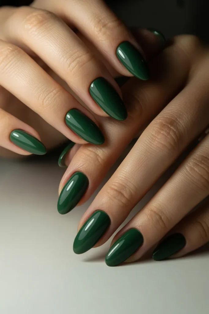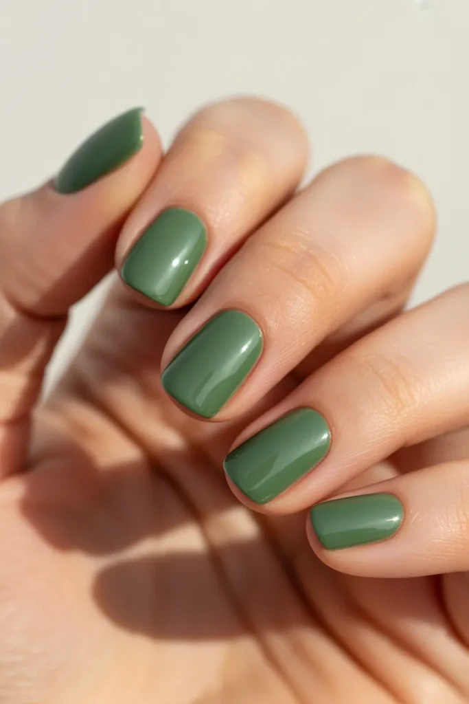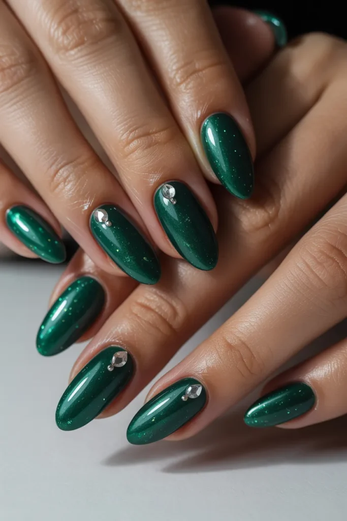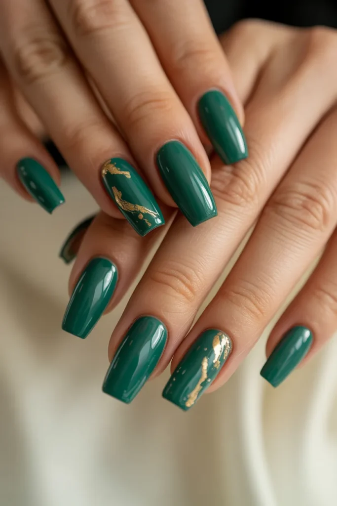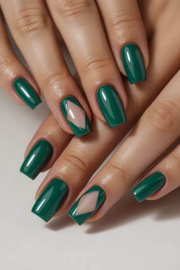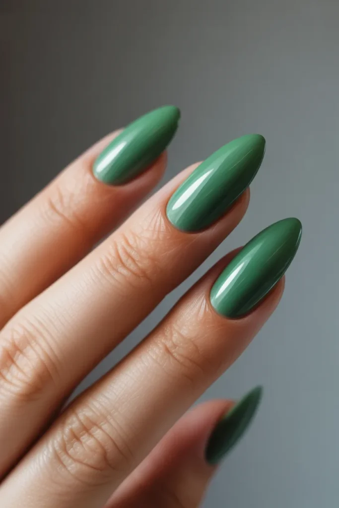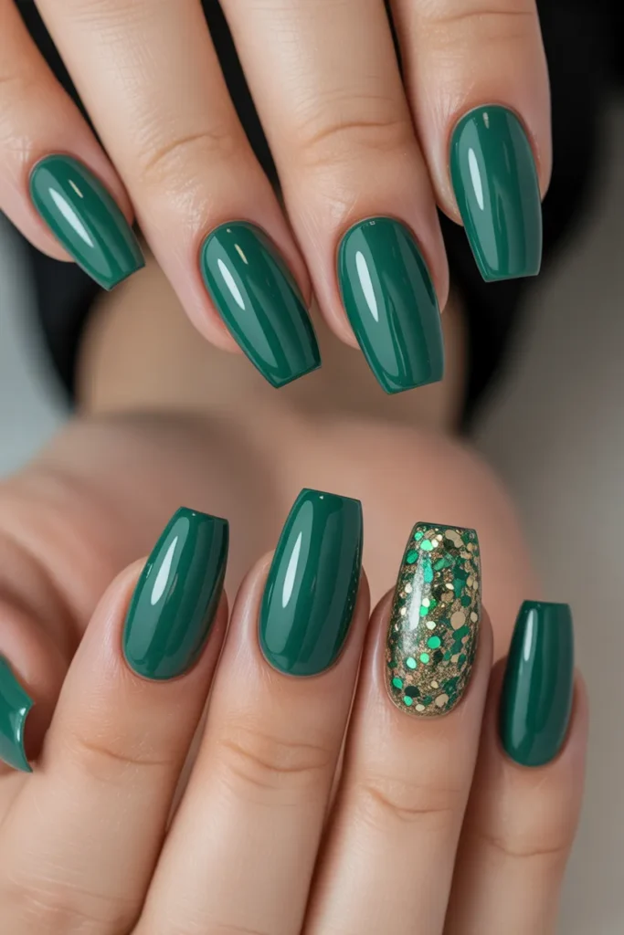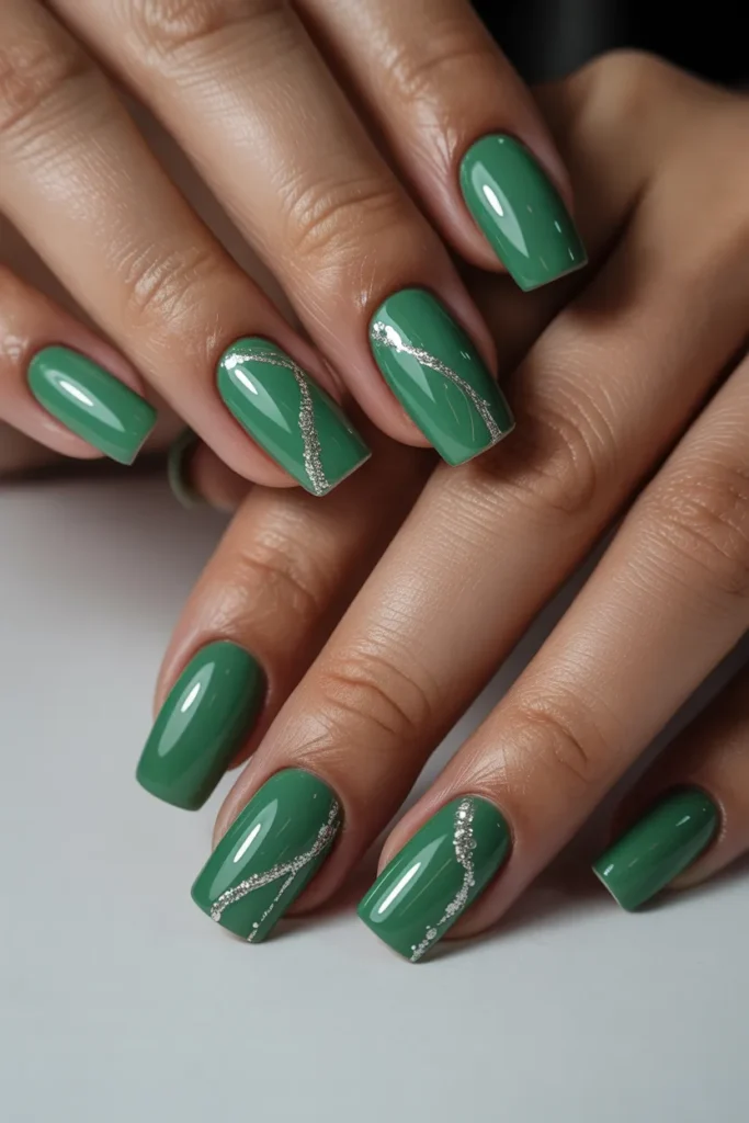 Add subtle sparkle with a glitter accent nail among solid jade nails. It’s a simple way to elevate your manicure without being over-the-top. Ideal for those who love understated glamour.