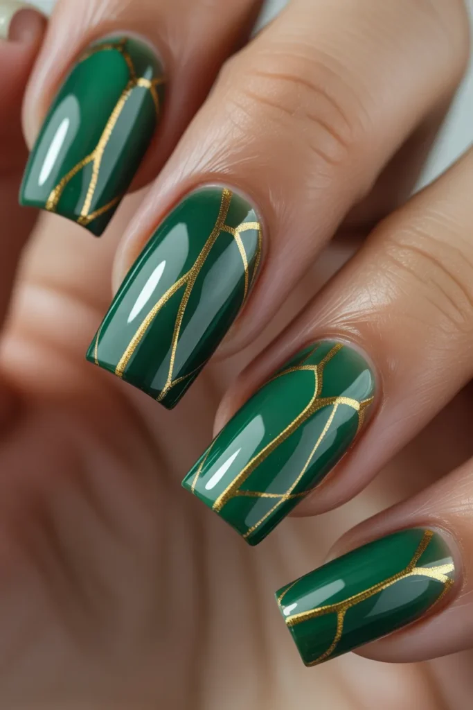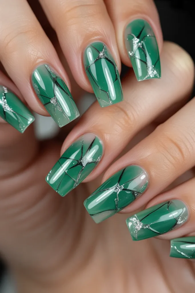 Inspired by artistic stained glass, this pattern mixes jade with gold or black outlines. The effect is luxurious and eye-catching, giving your nails a sophisticated, high-fashion look. Perfect for special events or parties.