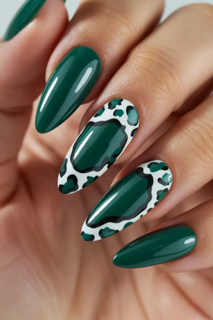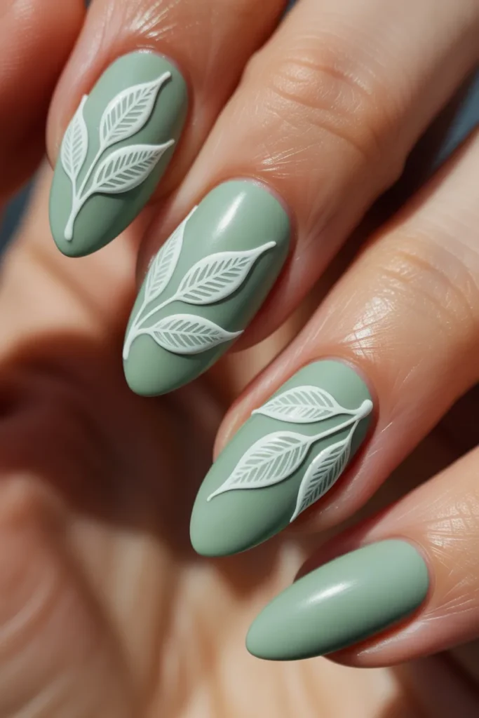 This design brings nature to your fingertips with delicate white or gold leaf patterns on a jade base. It’s perfect for a soft, elegant look that feels fresh and organic. Ideal for spring or a chic everyday manicure.