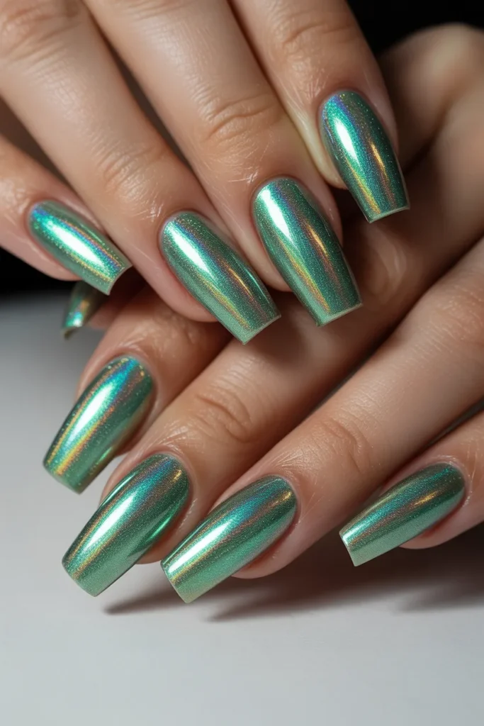 Holographic jade nails catch light in stunning ways, producing a rainbow-like shimmer. This design is bold, eye-catching, and perfect for nights out or special events. Holographic finishes elevate the simple jade green into a dazzling, magical manicure.