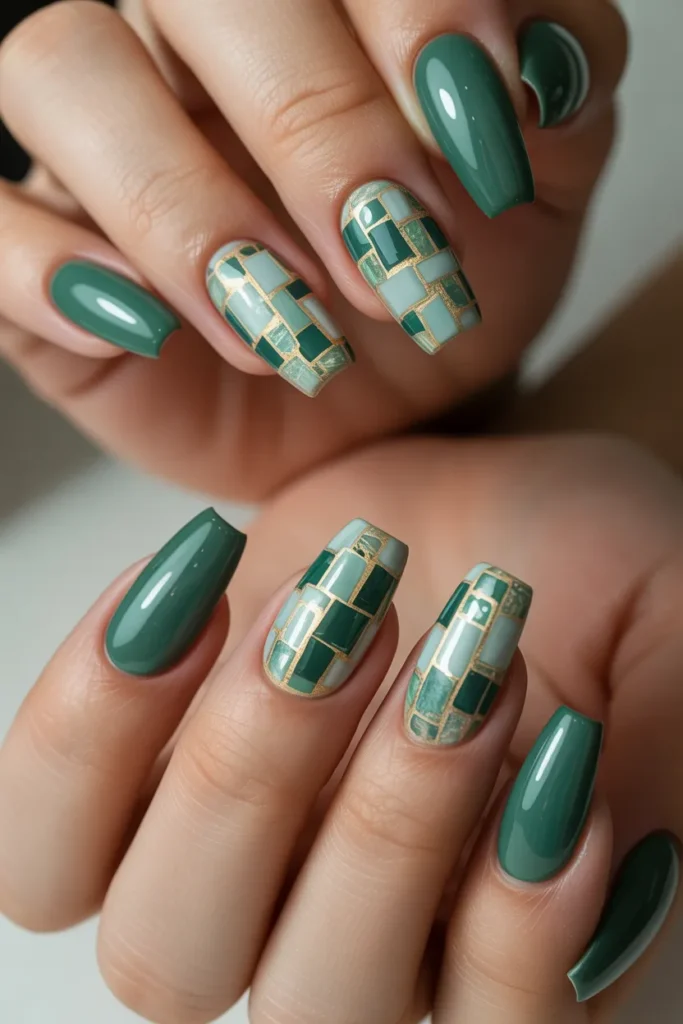 Mosaic jade nails are artistic and eye-catching, featuring tiny geometric patterns in varying green shades. They mimic the appearance of stained glass or tiled art, giving your nails a unique, creative flair. Ideal for statement manicures, this design pairs perfectly with neutral bases or gold accents for added sophistication.