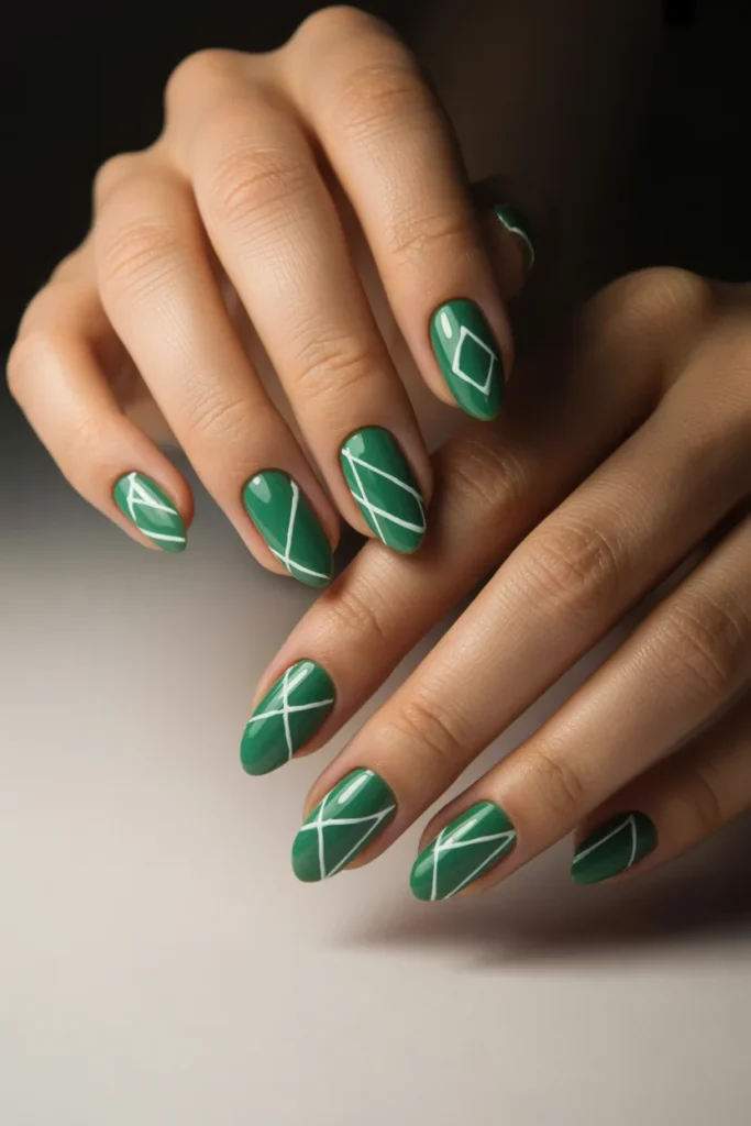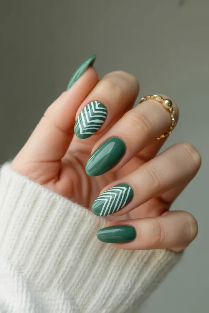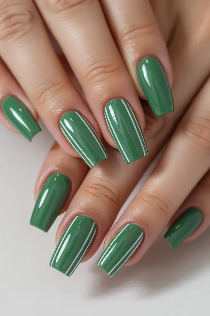 Clean, crisp stripes on a jade nail create a modern, minimalist vibe. You can play with vertical, horizontal, or diagonal lines in white, gold, or darker green. This design works well on both short and long nails.