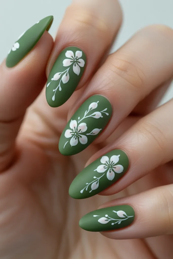 Hand-painted florals on a jade background create an elegant, feminine look. Soft white or pastel flowers make the nails feel delicate and artistic. Perfect for weddings, brunches, or any chic outing.