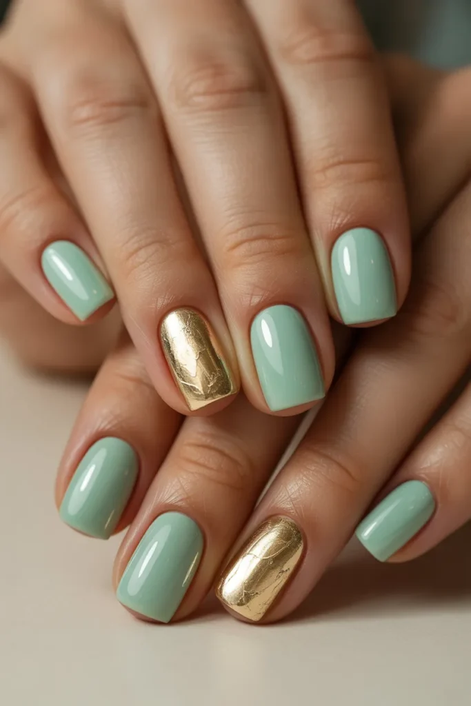 Combine jade nails with gold foil accents to create a luxurious, high-fashion look. The delicate gold pieces add shine and sophistication without overwhelming the jade base. Perfect for formal events, special occasions, or a glamorous everyday style.
