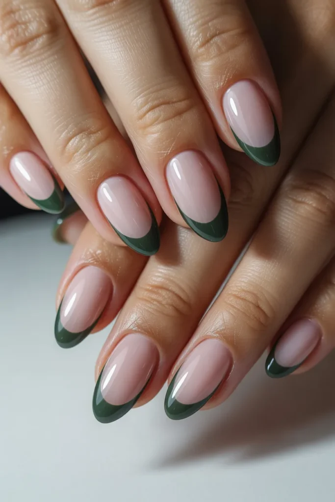 A modern take on the classic French manicure with glittering jade tips. The soft nude base and sparkling green tips create a sophisticated, playful contrast. Perfect for everyday elegance or special occasions.