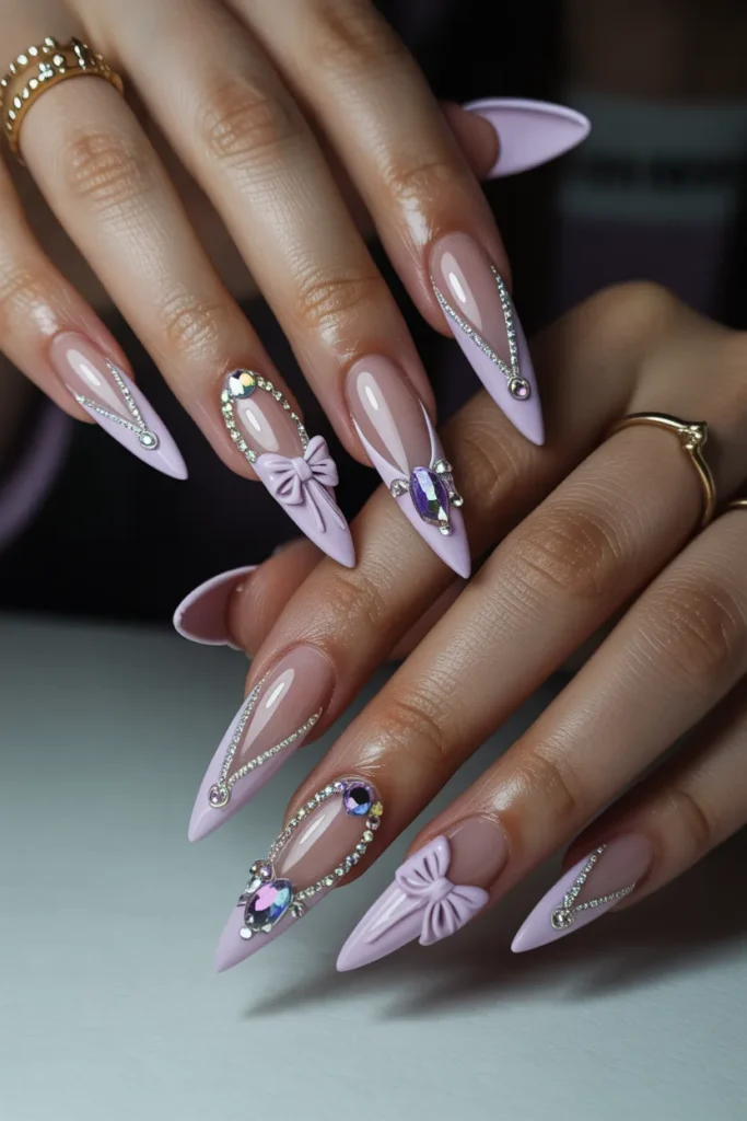 3D nail art on stiletto nails adds depth and dimension with embellishments like rhinestones, gems, bows, or sculpted designs. These nails are bold, eye-catching, and perfect for anyone who loves dramatic, standout manicures.