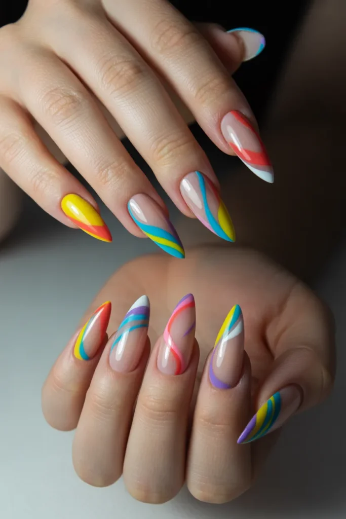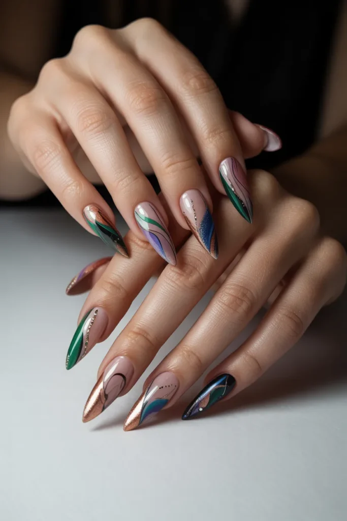 Abstract art nails on stiletto shapes are a modern and creative way to express yourself. Swirls, splashes, and geometric patterns create a one-of-a-kind artistic manicure that draws attention wherever you go.