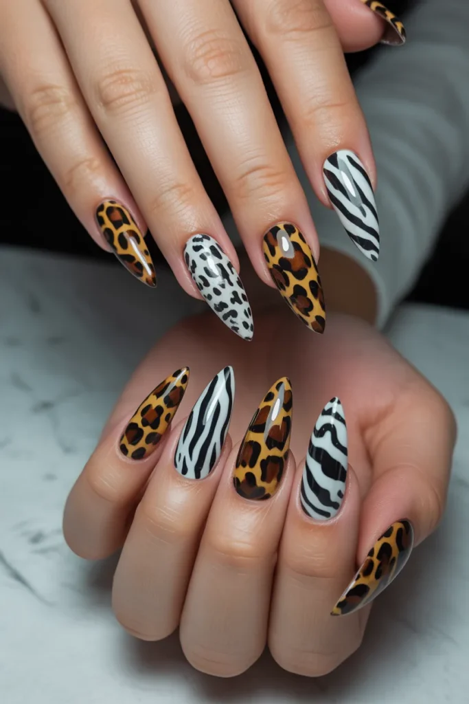 Animal print stiletto nails bring a wild and daring touch to your manicure. Leopard spots, zebra stripes, or snake patterns add bold, fashionable flair. Ideal for trendsetters who want to make a statement with their nails.