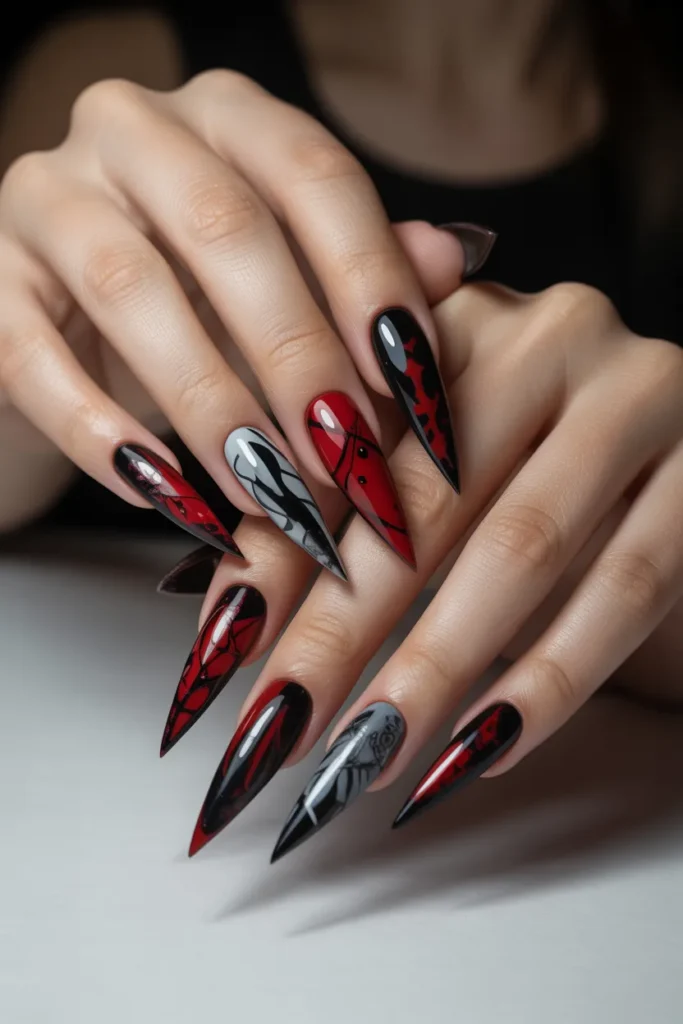 Coffin-inspired art on stiletto nails combines the elegance of the stiletto with the edgy vibe of coffin-shaped designs. These nails often feature sharp tips, bold colors, and unique art, perfect for fashion-forward nail enthusiasts.