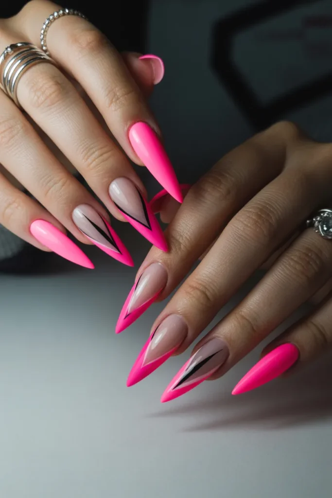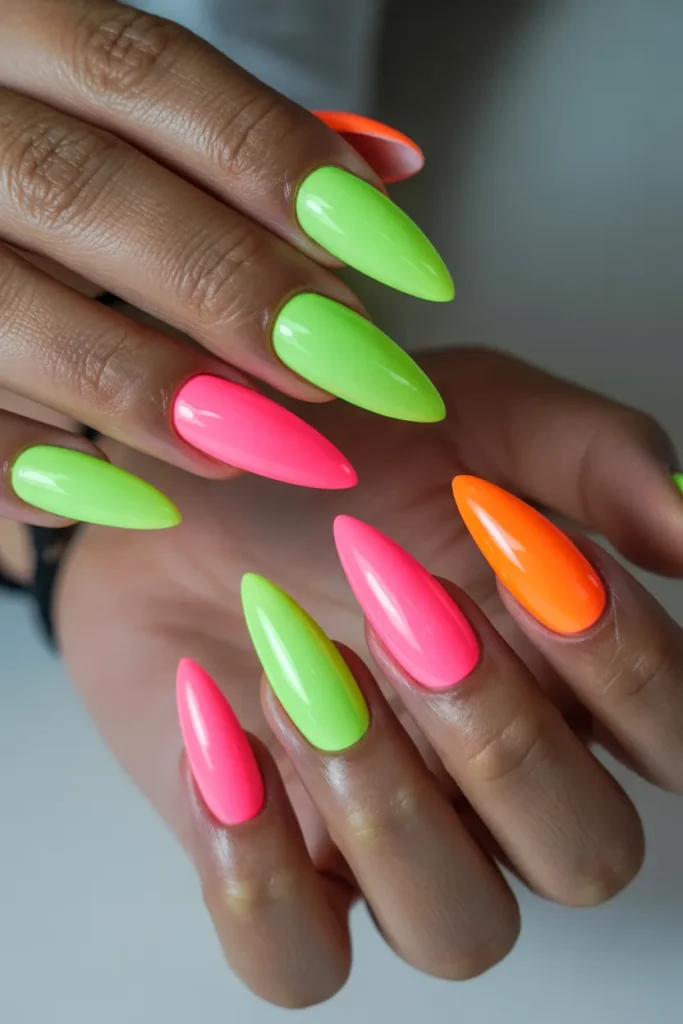 Neon stiletto nails are all about bold, eye-catching colors that make a statement. Bright shades like electric pink, lime green, and neon orange instantly grab attention. Perfect for summer festivals, parties, or a fun night out. These nails pair well with minimal accessories to let your manicure shine.