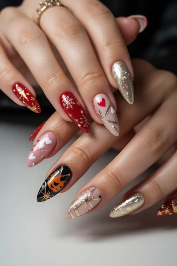 Holiday-themed stiletto nails capture the festive spirit with seasonal colors, patterns, and glitter. Perfect for Christmas, Valentine’s, Halloween, or New Year’s, these nails add cheer and style to any celebration